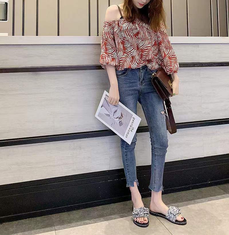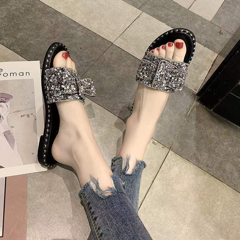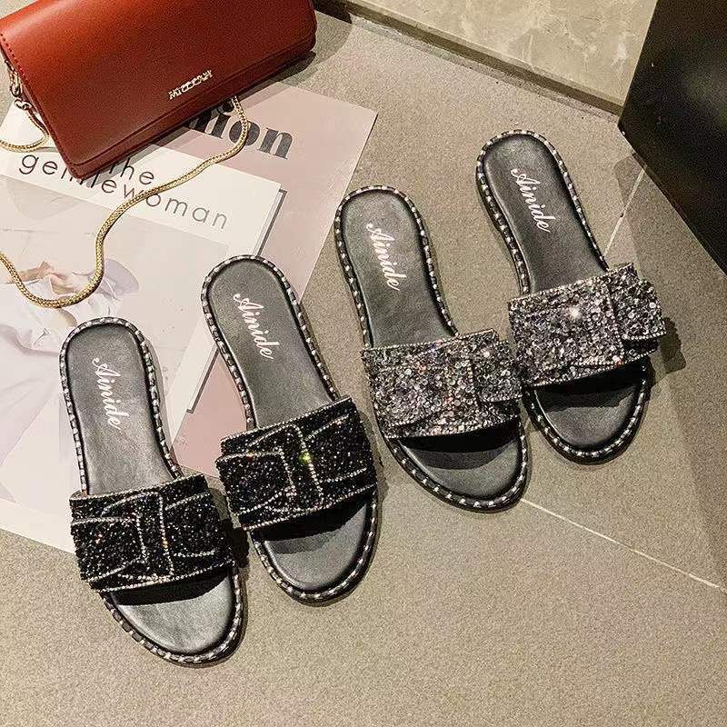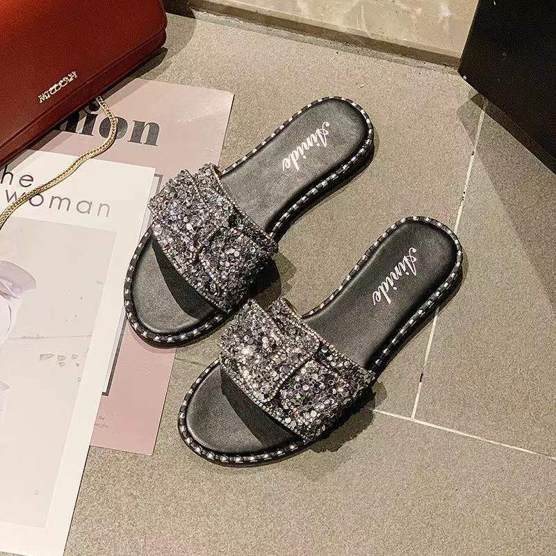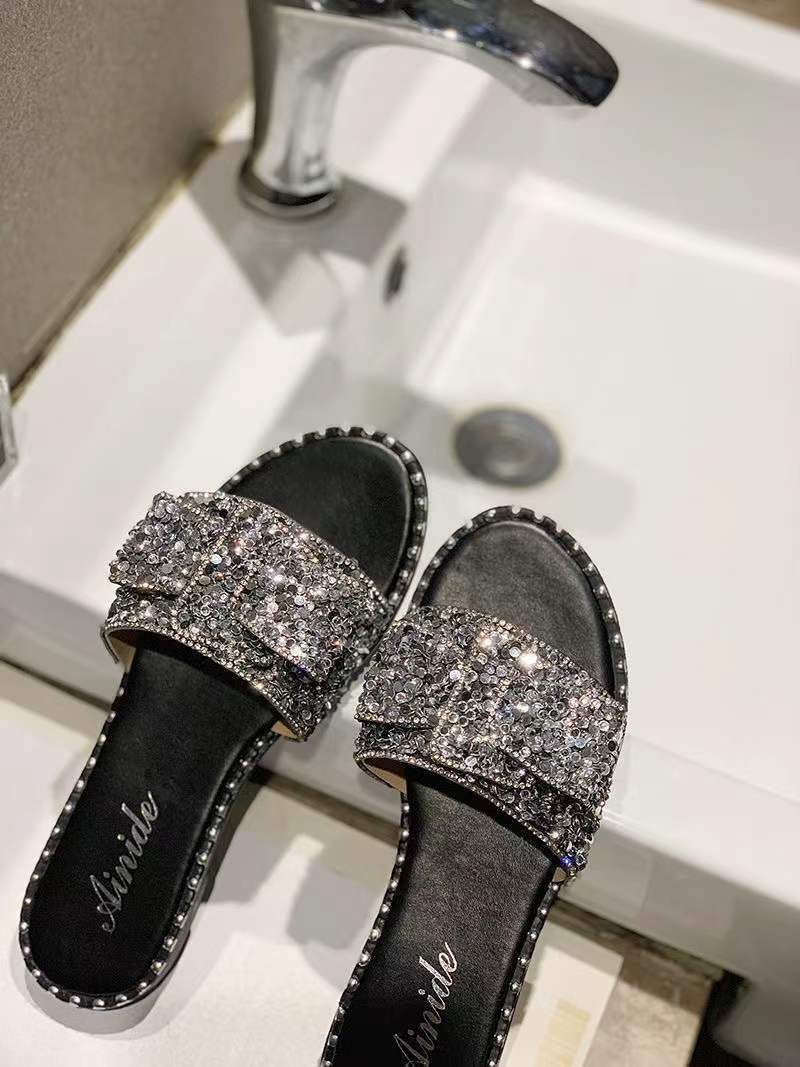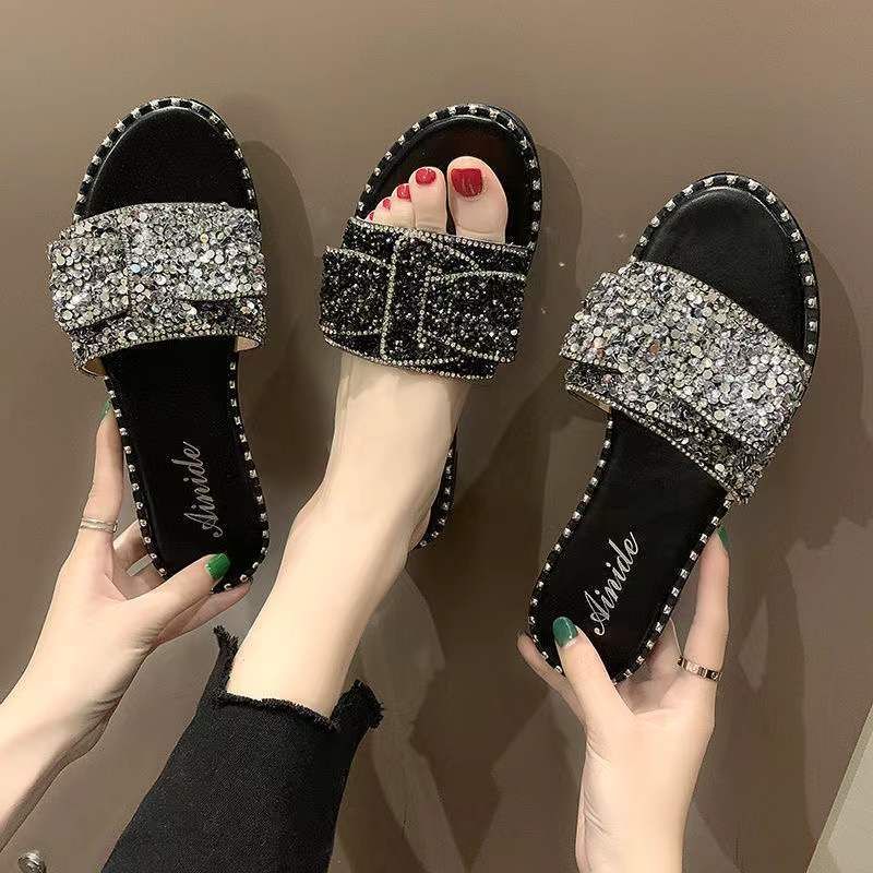 Large Size Women's Shoes 41-43 Slippers, Women's Summer Outer Wear, Korean version, thick-soled flip flops, all-match flat rhinestone slippers